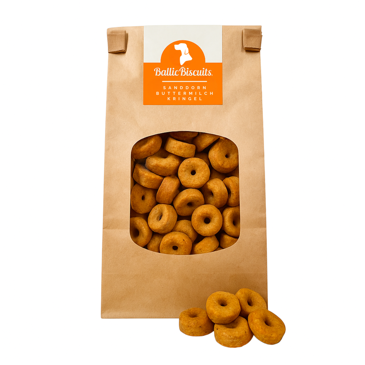 Ein kleiner Küstentraum im Keksformat – das sind unsere Sanddorn-Buttermilch-Kringel! Diese feinen Hundekekse vereinen das fruchtige Aroma des Sanddorns mit der milden Frische von Buttermilch und einem Hauch nordischer Brise.
